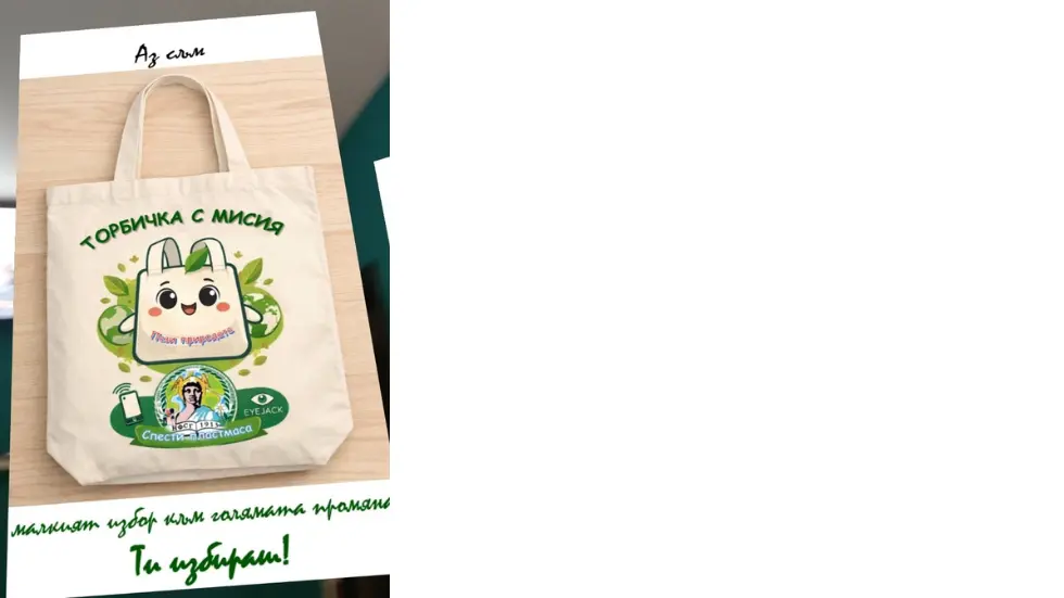 Другият екип изготвя реклама с добавена реалност „Торбичка с мисия“. За целта те използват приложенито за добавена реалност EyeJack. След като изтеглите приложението и сканирате следния QR код с камерата на телефона си, може да се насладите на рекламата. Тук споделяме с вас снимка от рекламата и таблица, в която се сравняват найлоновите торбички с торбичките за многократна употреба.