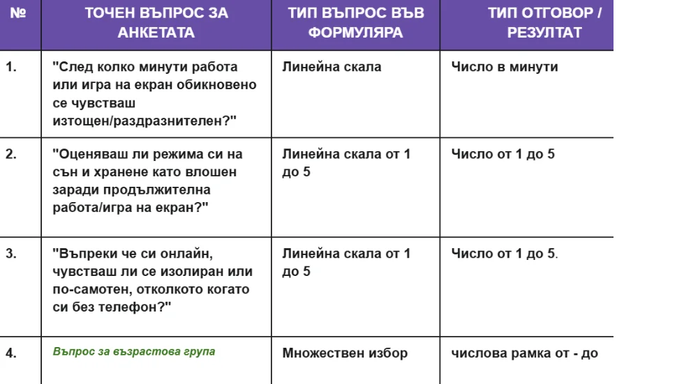 Следващата проектна задача на учениците е да направят социално проучване сред връстниците си. Целта на гимназистите е да определят какъв е критичният максимум екранно време, след който младите хора усещат промяна в настроението си - раздразнение, тревожност, апатия и т.н. Събирайки емпиричните данни от изследването, деветокласниците доказват необходимостта от “Крузо аларм” и “Мисии за физическа активност” и научно аргументират тази нужда.