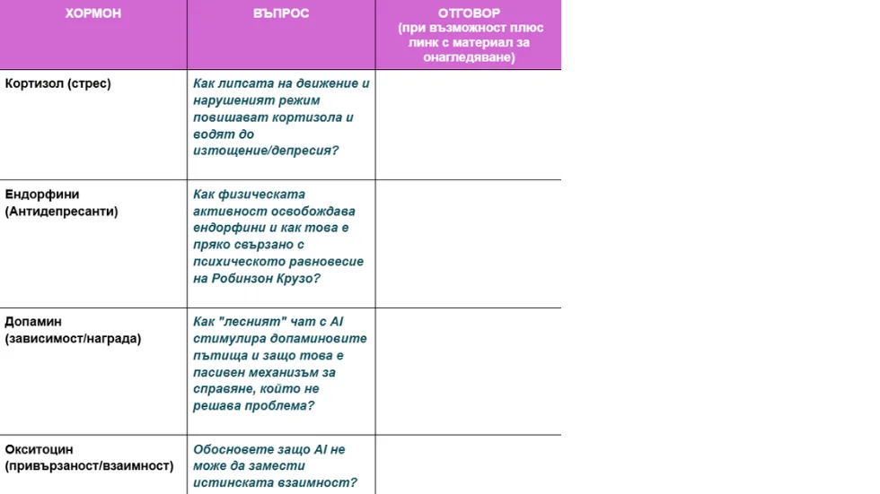 • Задача 2: Учениците отговарят на редица въпроси от типа: Как липсата на движение и нарушеният режим повишават кортизола и водят до изтощение?
