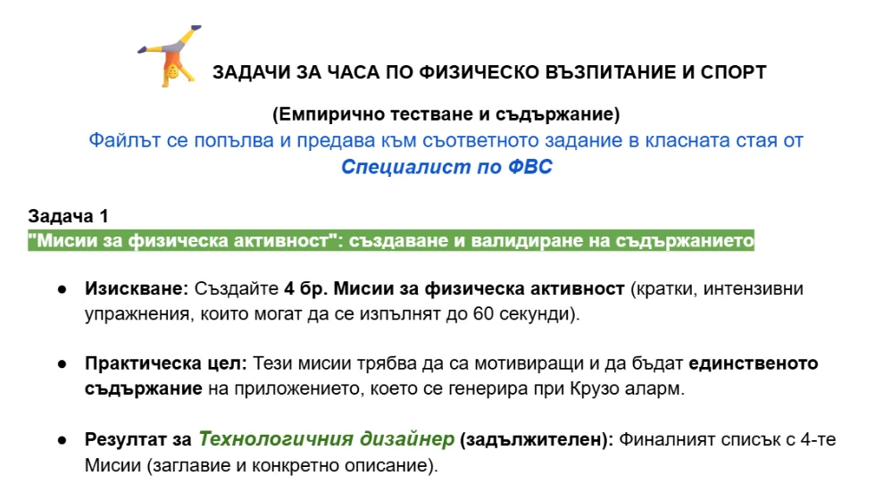 Мисиите за физическа активност също са гъвкави. Те не изискват специфично оборудване и екипировка. “Упражненията могат да бъдат адаптирани към местните условия и културни норми (например, традиционни игри, кратки разходки, екологични дейности), осигурявайки равен старт за всички ученици, независимо от социалното им положение.”, разказва учителката по БЕЛ.