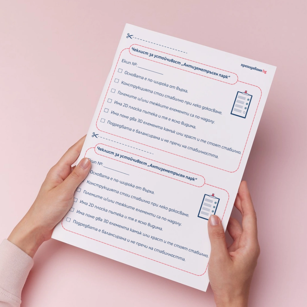 Този Canva шаблон представлява работен лист към урок „Земетресение в града: Коя конструкция ще оцелее?“ (Урок 3 от ПБО № 5 „Парк на геометричните чудовища” по Изобразително изкуство за 1. клас.) Чрез задачите в него учениците изследват принципите на стабилност и баланс при изграждането на триизмерни макети. Работният лист насочва вниманието към конструктивните особености на формите и връзката между пространственото разположение и устойчивостта на обектите.
