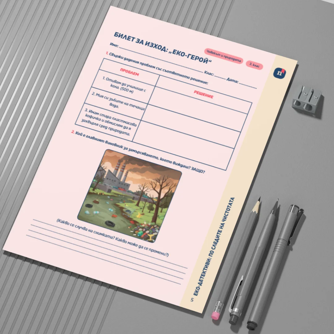 Този Canva шаблон представлява работен лист към урока „Еко-детективи: По следите на чистотата“ (Урок 7 по Човекът и природата за 3. клас). Чрез практически и ситуационни задачи учениците изследват замърсяването на въздуха и водата, разпознават основни замърсители и прилагат знанията си при анализ на последствията за живите организми.