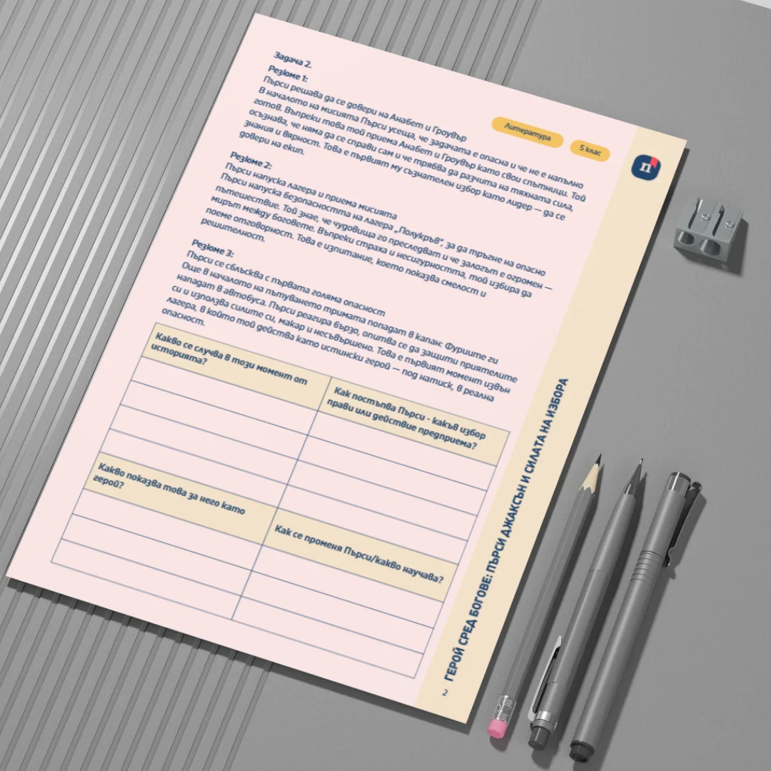 Този Canva шаблон представлява работен лист към урока „Герой сред богове – Пърси Джаксън и силата на избора“ (Урок 19 по Литература за 5. клас). Чрез анализ на ключови сцени и избори на героя учениците изследват темата за отговорността, смелостта и доверието. Работният лист насърчава осмислянето на връзката между избор, последици и личностно израстване.