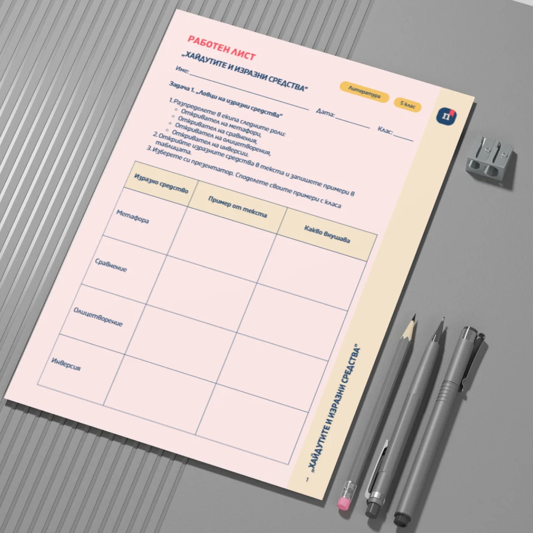 Този Canva шаблон представлява работен лист към урока „Хайдутите и изразните средства“ (Урок 9 по Литература за 5. клас). Чрез екипни и творчески задачи учениците разпознават и анализират изразни средства в художествен текст, свързан с темата за хайдутството. Работният лист съчетава откривателска дейност с творческо писане и прилагане на изучените понятия в собствен текст.