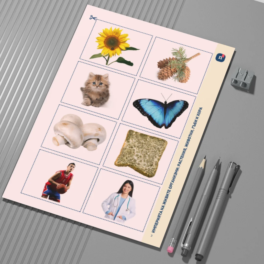 Този Canva шаблон представлява работен лист към урока „Империята на живите организми: Растения, животни, гъби и хора“ (Урок 12 по Човекът и природата за 3. клас). Чрез разнообразни задачи учениците разпознават основните групи живи организми, класифицират ги по отличителни белези и изграждат разбиране за тяхното разнообразие. Задачите насърчават наблюдение, сравнение и прилагане на знанията в практическа ситуация.