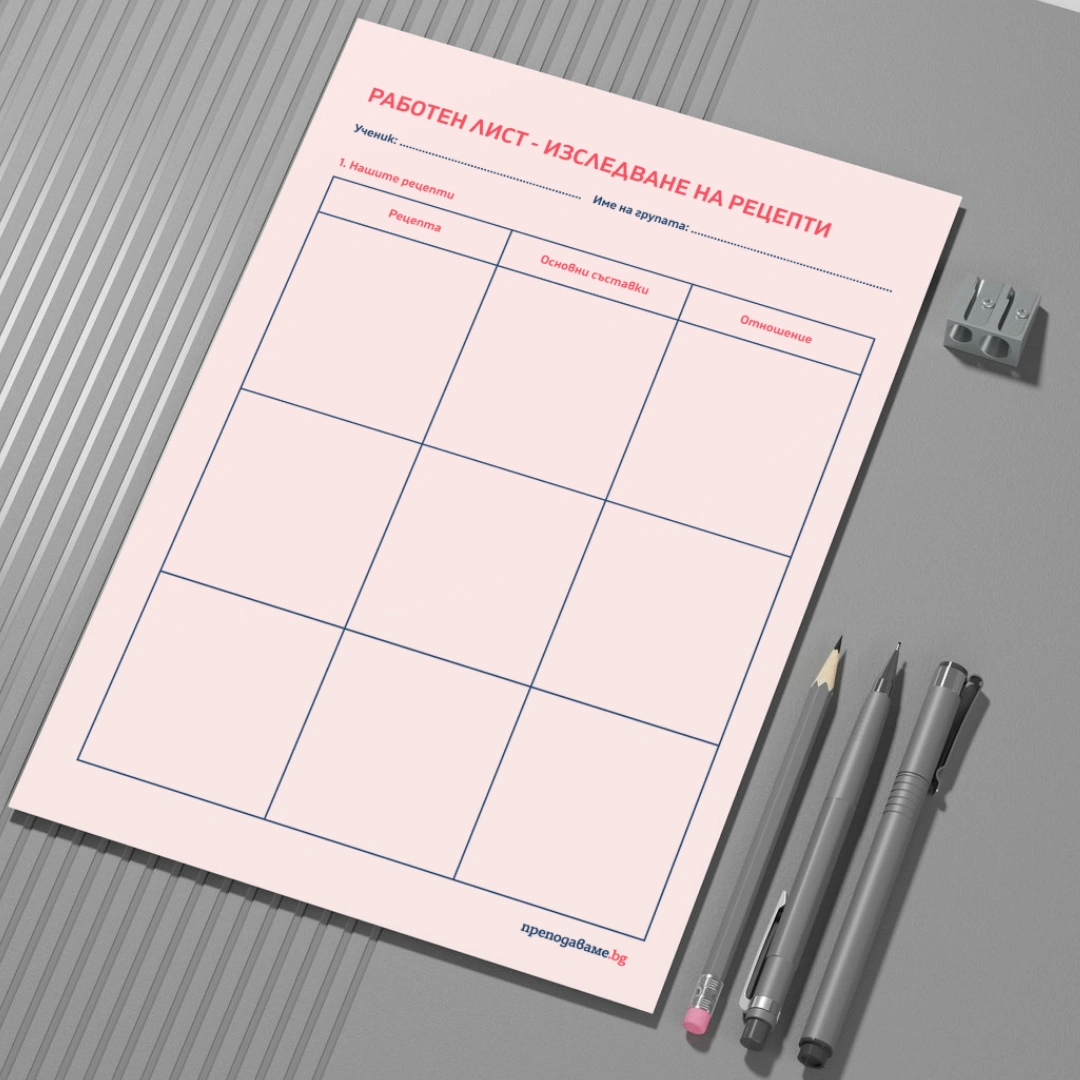 Този Canva шаблон представлява работен лист към урок „Откриваме тайните на отношенията в рецептите“ (Урок 2, от ПБО № 3 „Тайната на перфектната рецепта“ по Математика за 6. клас). Чрез задачите учениците изследват зависимости между съставките в рецепти и проследяват как се променят количествата при увеличаване на броя порции. Акцентът е върху откриване на закономерности и изграждане на разбиране за пропорционалност чрез практически примери.