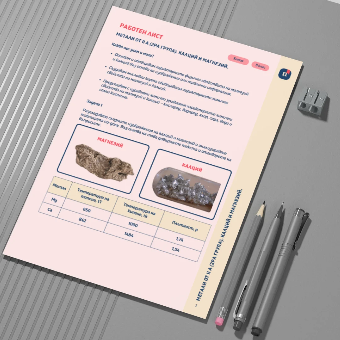 Този Canva шаблон представлява работен лист към урока „Метали от II A (2ра група). Калций и магнезий“ (Урок 7 по Химия за 8. клас). Чрез разнообразни задачи учениците анализират строежа и свойствата на магнезия и калция и изследват връзката между електронната структура на атомите и тяхното химично поведение. Работният лист подпомага осмислянето на физичните и химичните свойства на металите чрез работа с изображения, таблици и химични уравнения.