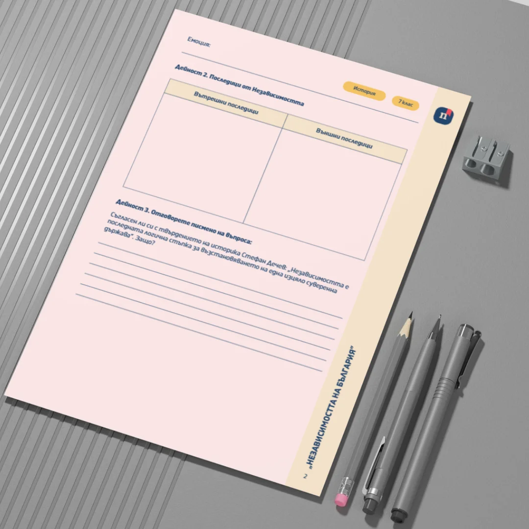 Този Canva шаблон представлява работен лист към урока „Независимостта на България“ (Урок 19 по История за 7. клас). Чрез разнообразни задачи учениците изследват причините, довели до обявяването на Независимостта, както и нейните вътрешни и международни последствия. Работният лист насърчава учениците да анализират исторически източници, да формулират аргументи и да осмислят значението на събитието за развитието на българската държава.