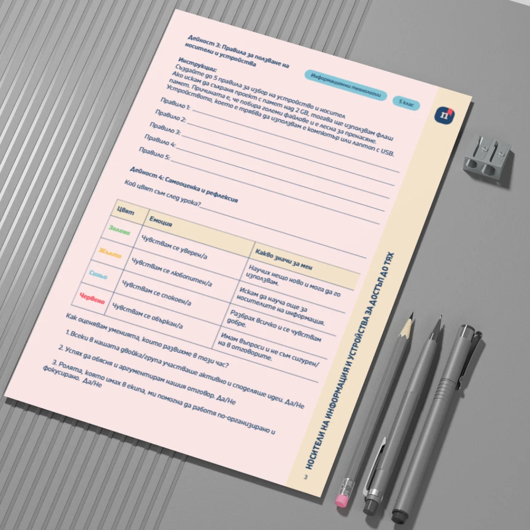 Този Canva шаблон представлява работен лист към урока „Носители на информация и устройства за достъп до тях“ (Урок 2 по Компютърно моделиране и информационни технологии за 5. клас). Чрез практически задачи учениците изследват различни носители на информация и устройствата, чрез които се осъществява достъп до нея. Работният лист насърчава учениците да сравняват различни технологични решения и да правят аргументиран избор в реални житейски ситуации.