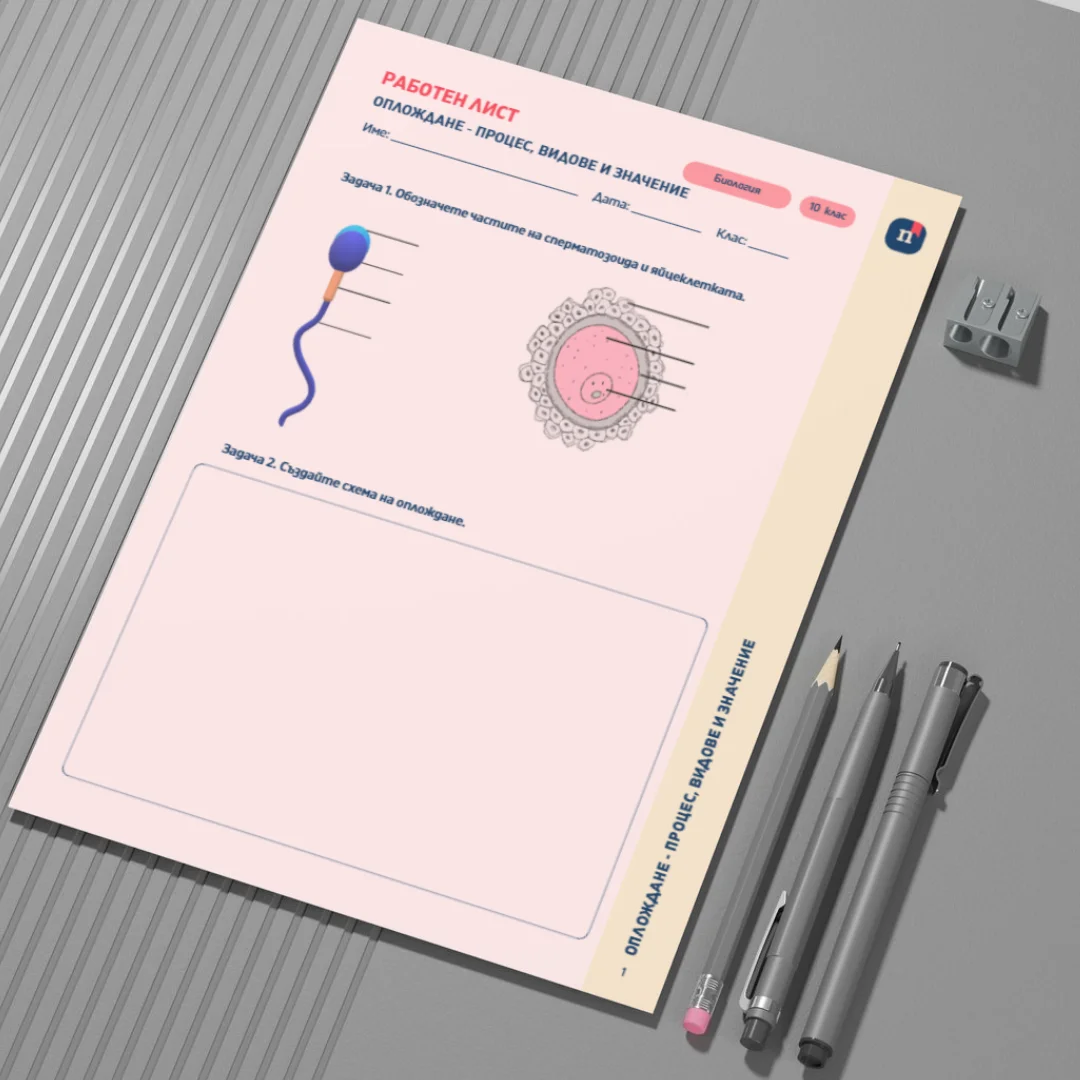 Този Canva шаблон представлява работен лист към урока „Оплождане“ (Урок 17 по Биология за 10. клас). Чрез разнообразни задачи учениците изследват структурата на половите клетки, процеса на оплождане и разликите между вътрешно и външно оплождане. Работният лист съчетава схема, сравнителен анализ и казус, насочен към разбиране на адаптациите при различни видове организми.