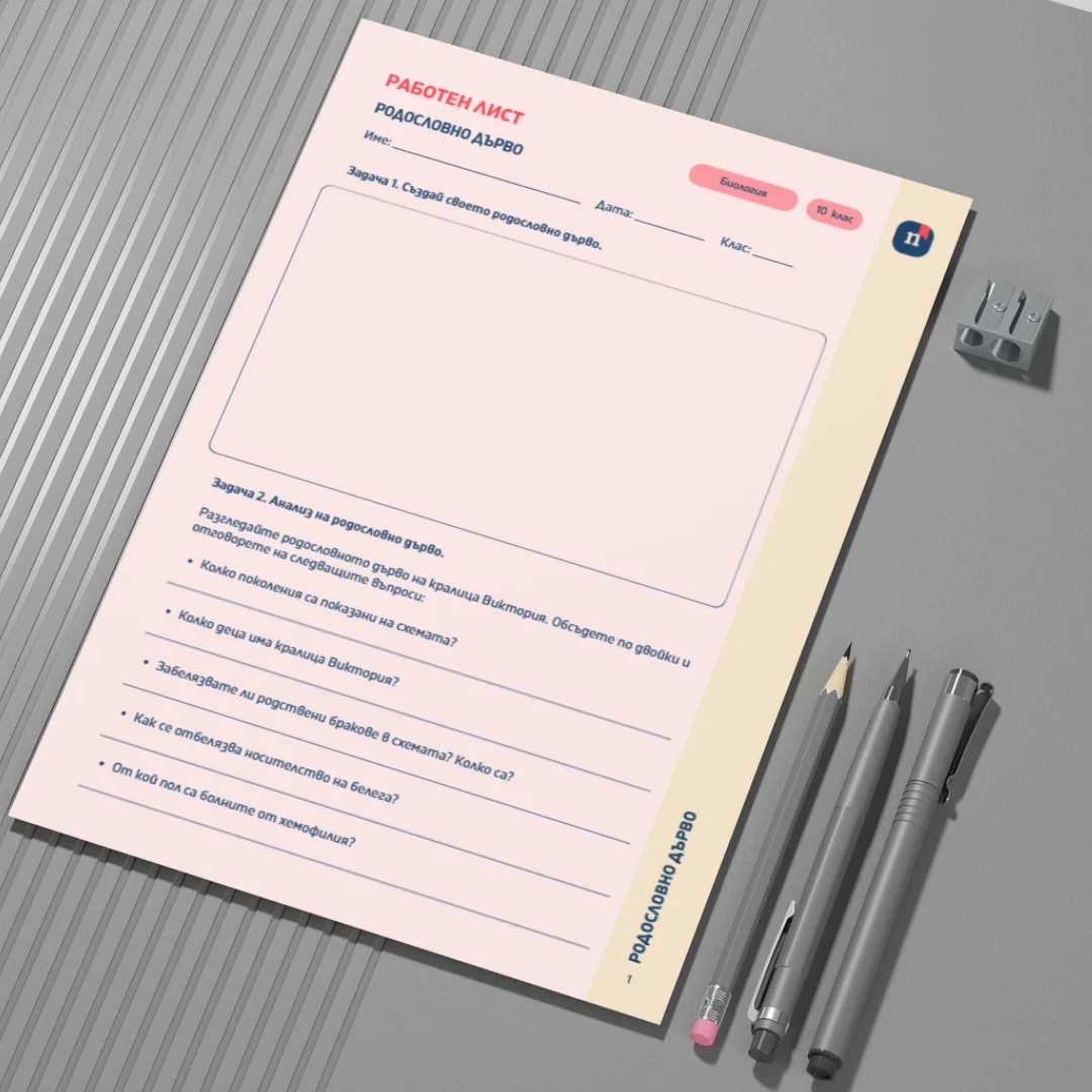 Този Canva шаблон представлява работен лист към урока „Родословно дърво“ (Урок 11 по Биология за 10. клас). Чрез анализ на родословното дърво на кралица Виктория и практически задачи учениците изследват начина на представяне и проследяване на наследствени белези и заболявания. Работният лист насърчава прилагането на генетични знания при определяне на тип наследяване и изчисляване на вероятности.