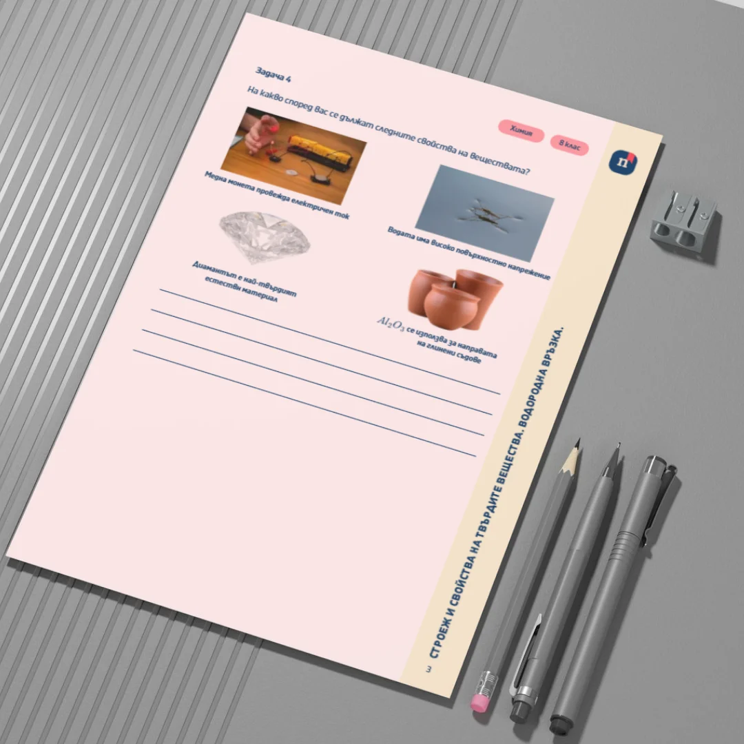 Този Canva шаблон представлява работен лист към урока „Строеж и свойства на твърдите вещества. Водородна връзка.“ (Урок 6 по Химия за 8. клас). Чрез разнообразни задачи учениците анализират връзката между строежа на твърдите вещества и техните физични свойства. Работният лист подпомага разбирането на различните видове кристални решетки и представянето на водородната връзка между молекули.