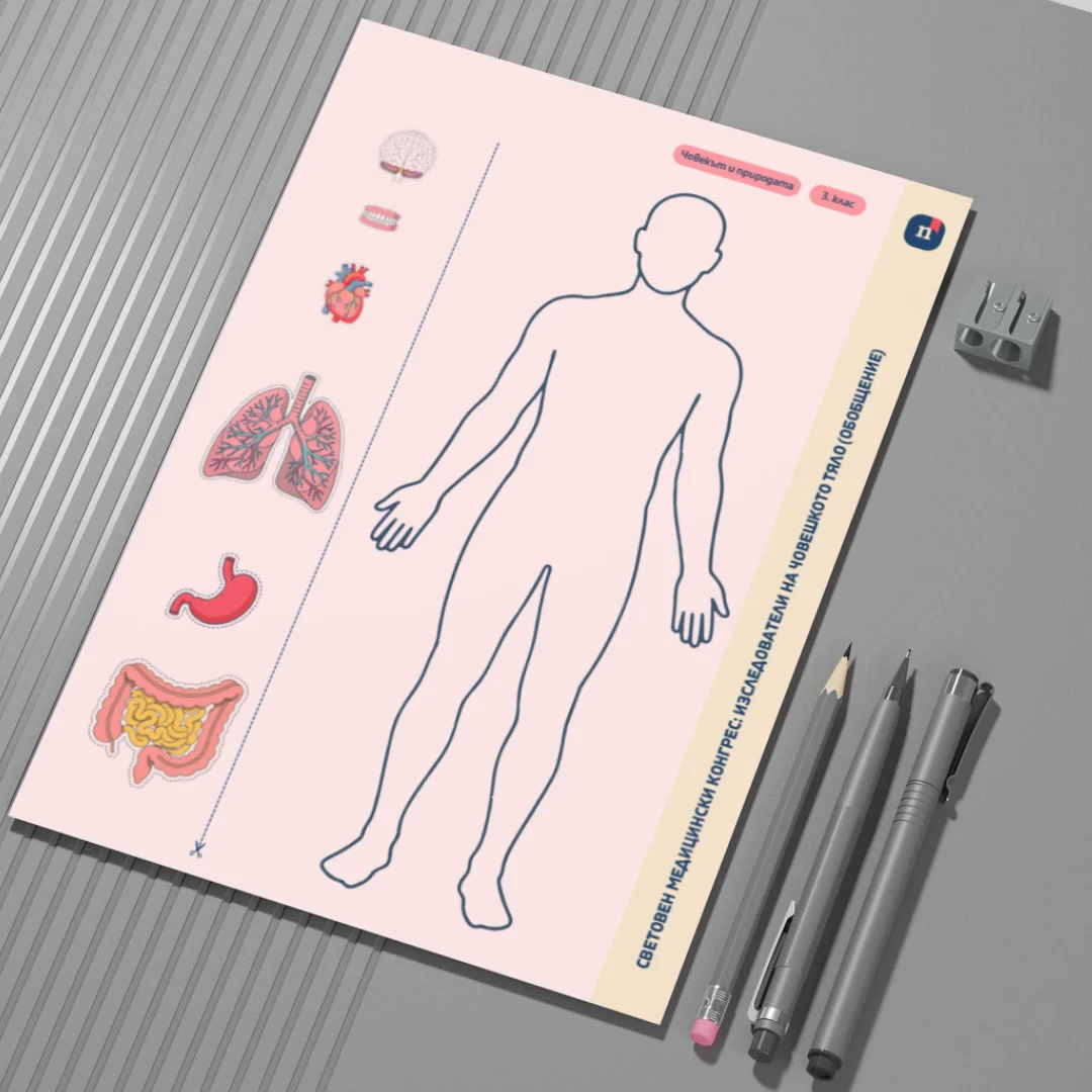 Този Canva шаблон представлява работен лист към урока „Световен медицински конгрес: Изследователи на човешкото тяло (Обобщение)“ (Урок 30 по Човекът и природата за 3. клас). Чрез разнообразни задачи учениците обобщават знанията си за човешкото тяло, като разпознават органи, свързват техните функции и прилагат знанията си в практически ситуации, свързани със здравето. Задачите насърчават систематизиране, анализ и аргументиране на избор.