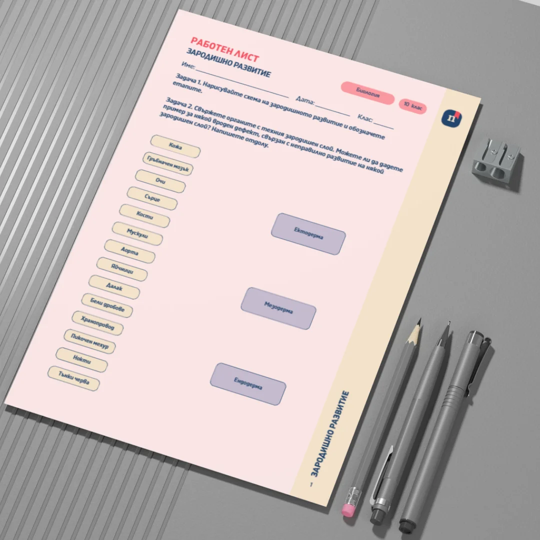 Този Canva шаблон представлява работен лист към урока „Зародишно развитие“ (Урок 18 по Биология за 10. клас). Чрез схематично представяне и аналитични въпроси учениците проследяват основните етапи на ембрионалното развитие и свързват зародишните слоеве с формирането на органи. Работният лист насърчава последователното мислене, прилагането на биологични понятия и осмислянето на значението на правилното развитие на организма.