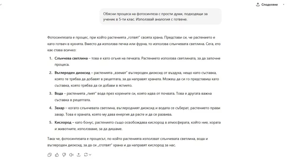 - Лош промпт (твърде общ): фотосинтеза