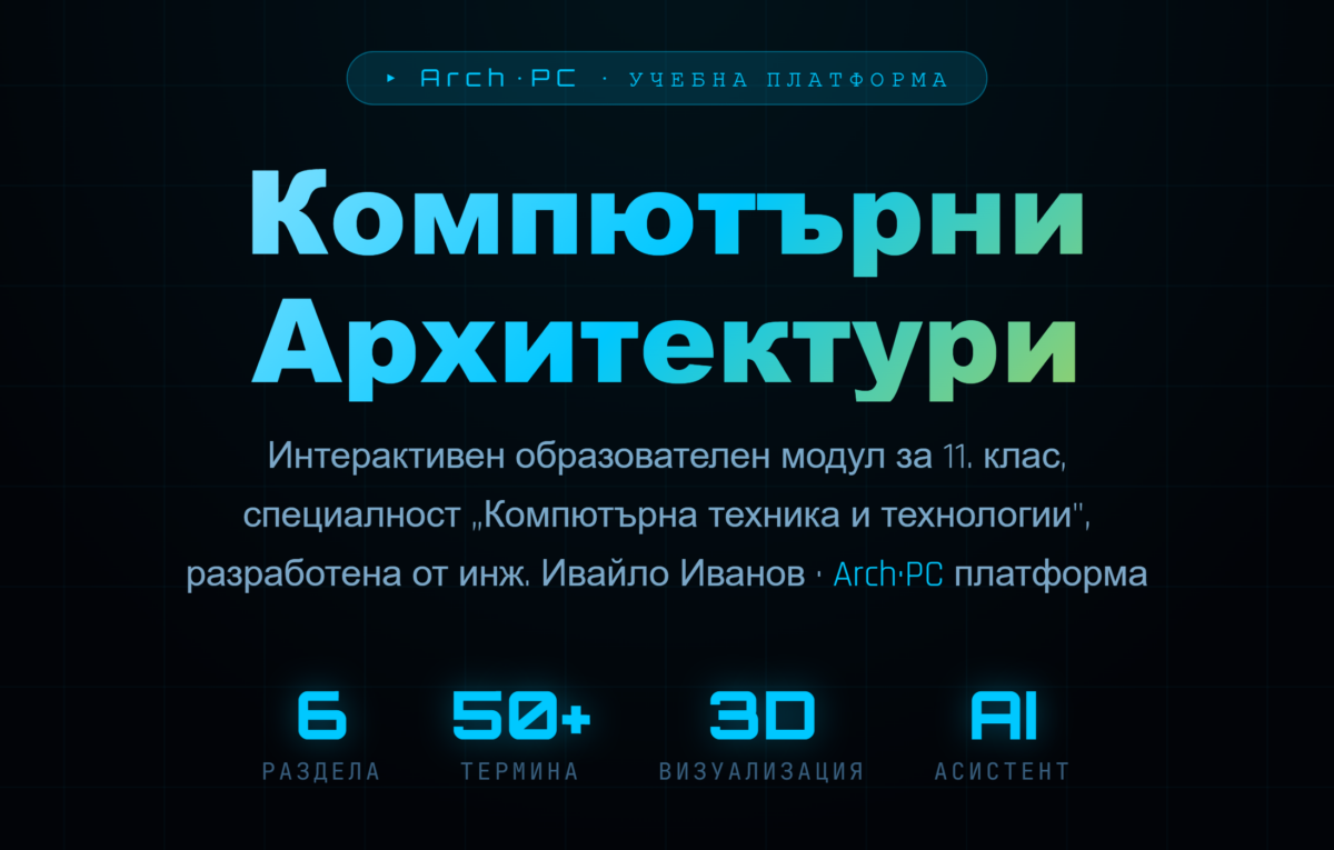 Искам да създадеш цялостно, модерно и интерактивно образователно уеб приложение на тема “”Компютърни архитектури”” за 11. клас, специалност “”Компютърна техника и технологии””. То трябва да работи напълно самостоятелно с HTML, CSS и JavaScript, без база данни. Приложението трябва да демонстрира: