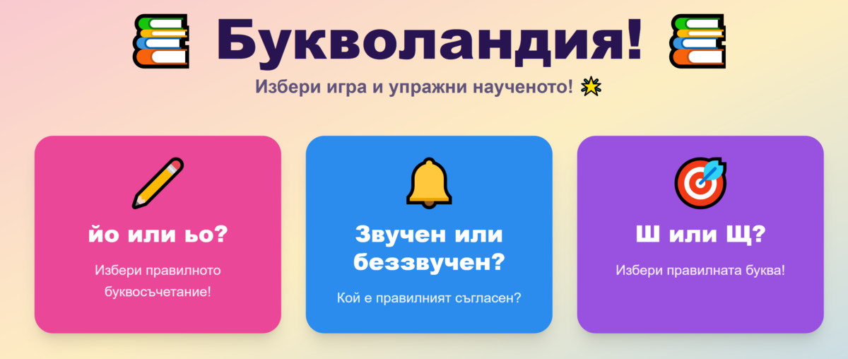Уеб приложение за първи клас, с възможност за избор от 4 игри: йо или ьо, звучен или беззвучен съгласен, ш или щ. първо ниво йо или ьо – мин_р, ма_неза, акт_р, д, фриз_р, под думите два бутона с възможни отговори йо и ьо. Второ ниво – гра (бутони д и т), зале_ (бутони з и с), панто_ (бутони в и ф), ета_ (бутони ж и ш), мра_ (бутони г и к), трето ниво – ко_, но_, ле_а, ба_а, ло_ , под тях бутони ш и щ. При верен отговор бутонът се оцветява в зелено, при грешен в червено, бутоните да са големи, шрифта също, за да се чете добре. Да отброява точки. В края да изписва Браво! Цветен интерфейс подходящ за първи клас. Име на играта: Букволандия! “