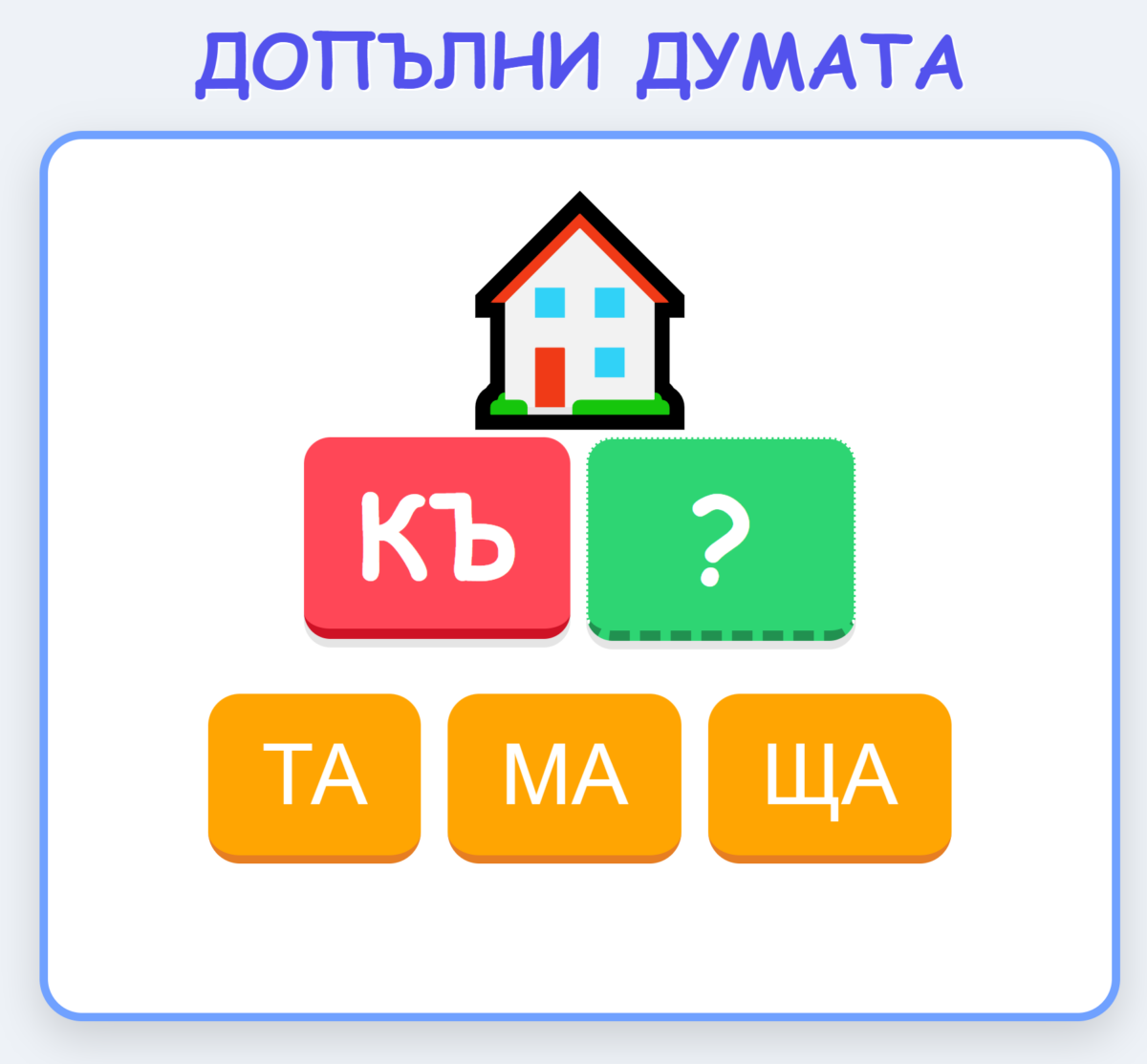 Броят на думите са 20. Всяка дума е обяснена с картинка, за да е подходящо за деца с обучителни затруднения. Прочита се думата, като се избира с кликване с коя сричка да се допълни.