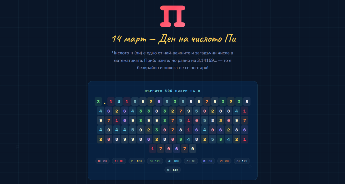 Приложението е създадено по повод Международния ден на числото Пи и е предназначено за ученици от 5. до 7. клас. То е разделено на шест раздела, достъпни чрез навигацията в горната част. Началният екран показва първите 100 цифри на π, оцветени по стойност, заедно със статистика за честотата на всяка цифра. В раздела „История” е представена хронология на ключови моменти — от Древен Египет до съвременния световен рекорд от 202 трилиона цифри. Картите в „Реален свят” илюстрират къде се среща π в ежедневието — от строителството и космоса до медицината.