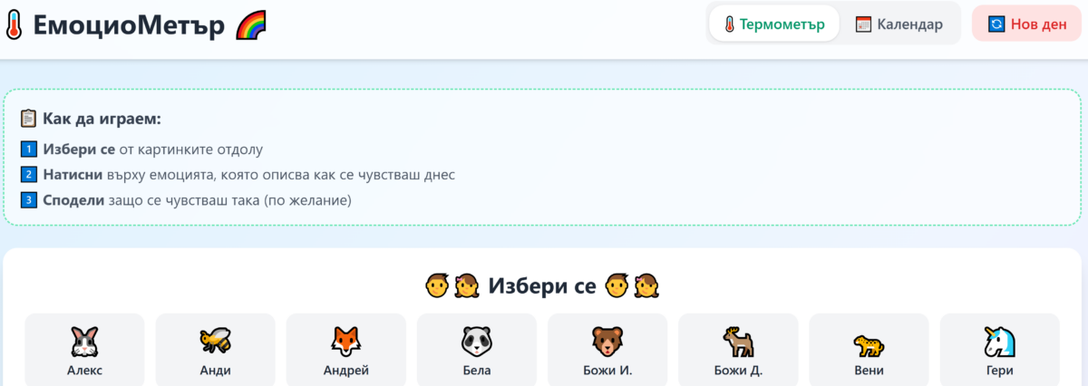 В началото на деня всеки ученик поставя щипка/магнит със своето име върху „термометър“ (спокоен – радостен – притеснен – ядосан – тъжен).