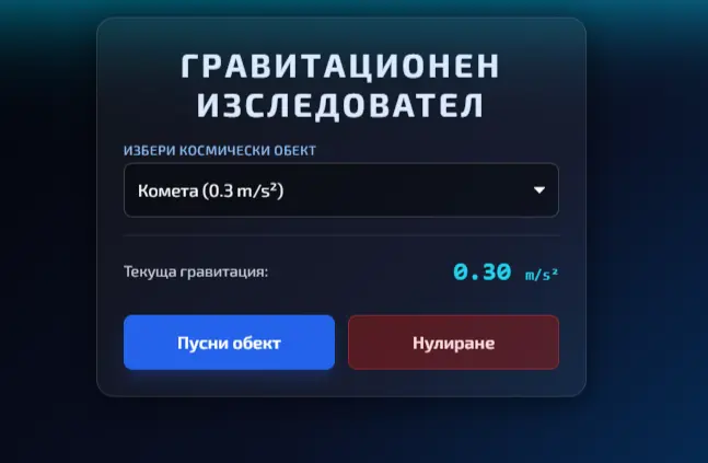 Този интерактивен симулатор, наречен „Гравитационен изследовател“, позволява на учениците да експериментират с гравитацията на различни космически обекти. Приложението предлага потапящо визуално изживяване, при което средата се променя динамично — от ледената повърхност на комета с почти нулева гравитация до смазващата сила на масивна звезда. Учениците могат да пускат различни обекти, да наблюдават скоростта им на падане и да взаимодействат с тях в реално време, превръщайки сложните концепции на астрофизиката в забавно и образователно приключение.