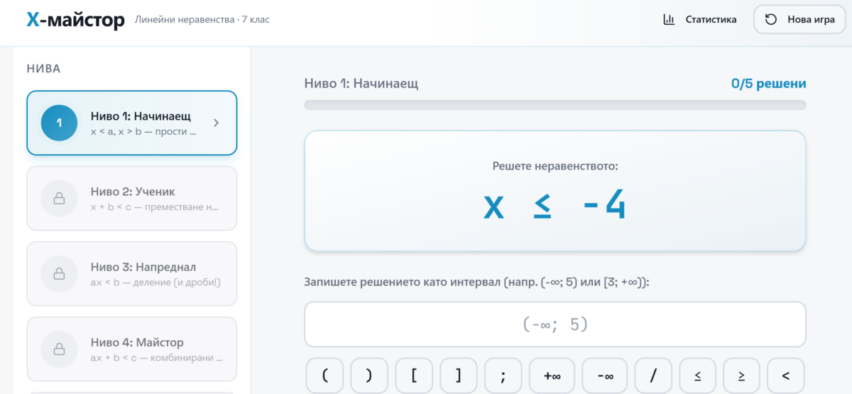 Създай интерактивно образователно приложение за решаване на линейни неравенства в 7 клас да има 5 нива и всяко да се отключва след успешно преминаване на предишното ниво.Да се започва от най-простото ниво,в което да се показва връзката между неравенство хВ ,а също и нестроги такива с числовата ос и с интервалите.,после да се повишава сложността до ниво Експерт -със скоби и едночлен с х и от двете страни.Да има възможност за писане на скоби ,квадратни скоби ,наклонена черта ,+безкрайност и -безкрайност директно в приложението и да може да приема както обикновени дроби с / така и със запетая или точка.Името на приложението да е Х-майстор,и към всяка задача да има и подсказка за решение.
