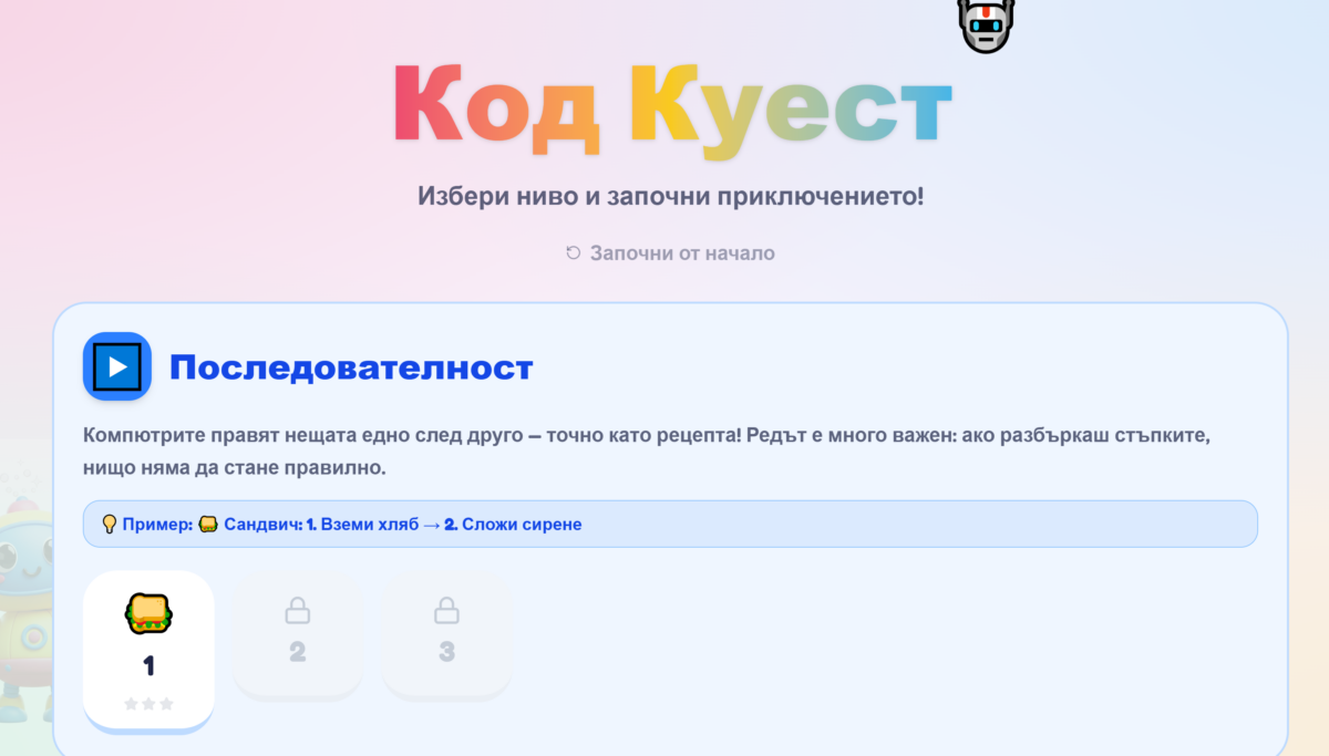 “Направи образователна игра за осем годишни в която се учат да програмират. Не трябва да е с управление на герой или друго, много са тривиални и вече скучни за децата. Да е цветна и забавна и с 15 нива.