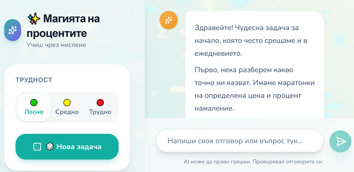 Генерира задачи чрез бутон “Нова задача” и избор на ниво на трудност (1/3). “Води” разговор в диалогов прозорец. Полезно е за всички възрастови групи, които се затрудняват с изчисляване на проценти. Целта е упражняване на материала в 5.клас и компенсиране на дефицити на учениците в следващите класове.