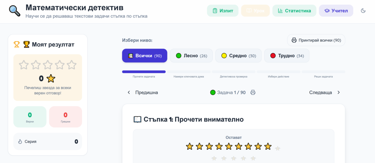 Създай приложение в помощ на ученици в 3 клас при решаване на текстови задачи. Направи алгоритъм, които да следват. Обърни внимание на косвените задачи. Как да разберат дали задачата е косвена? Да знаят как да означат математически следните изрази “повече”, “по-малко”, пъти повече”, “пъти по-малко”.