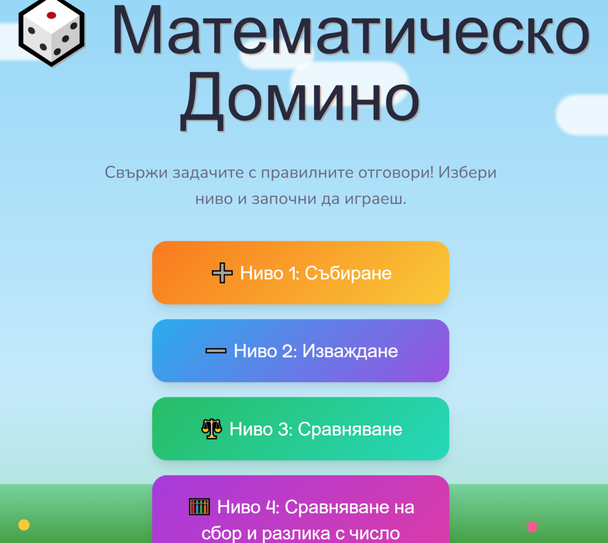 “Математическо домино” има за цел да подпомогне затвърждаването на основни математически знания чрез игрови подход. Приложението развива уменията за пресмятане и сравняване на числа, както и бързината и точността при решаване на задачи.