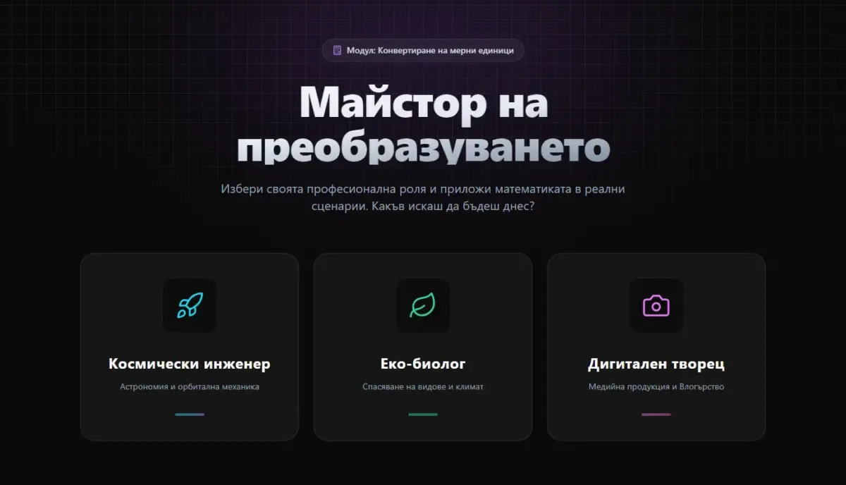 Всяка задача е представена като PISA-стил сценарий (функционална грамотност), където преобразуването на единиците е критично за успеха на мисията (например: изчисляване на скоростта на дрон или дозиране на лекарство за морска костенурка). Чрез използването на „стъклен“ UI дизайн (glassmorphism) и ангажиращи визуални ефекти, приложението превръща упражненията в игрово преживяване (gamification), подходящо за ученици в прогимназиален етап.