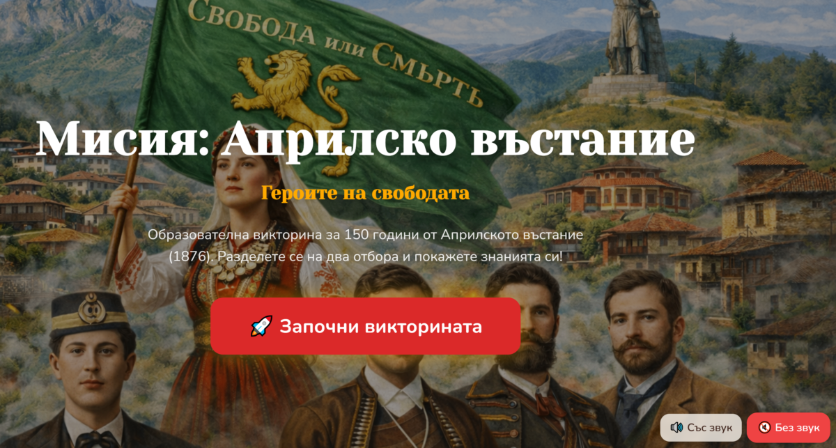 “Създай интерактивно уеб приложение – образователна викторина със състезателен характер за ученици от 3, 4 и 5 клас на тема „150 години от Априлското въстание (1876)“. Заглавие на приложението: „Мисия: Априлско въстание – героите на свободата“. Цел на приложението: Да помогне на учениците да научат основни факти за Априлското въстание чрез игра тип състезание между два отбора. Основни функционалности: 1. Начален екран • голямо заглавие на играта • бутон „Започни викторината“ • кратко описание на темата 2. Екран за избор на отбори • два отбора: „Лъвове“ и „Орли“ • визуални икони или символи за отборите 3. Игрови режим • учениците са разделени на два отбора • въпросите се задават последователно • всеки правилен отговор носи 1 точка • показва се текущият резултат • таймер за отговор (20 секунди) 4. Финален екран • показва победителя • поздравително съобщение • бутон „Играй отново“ Въпроси: Създай общо 30 въпроса, разделени така: • 15 въпроса за Отбор „Лъвове“ • 15 различни въпроса за Отбор „Орли“ Всеки въпрос трябва да съдържа: • текст на въпроса • 3 или 4 възможни отговора • ясно отбелязан правилен отговор Дизайн на приложението: • цветен и приятелски интерфейс, цветовете да са топли • подходящ за ученици от 3, 4 и 5 клас • използвай исторически елементи: o българското знаме o революционни знамена o карта на България o картини от Копривщица, Клисура, Панагюрище • големи бутони и лесна навигация Сложи ми тиха музика за фон на викторината, която е подходяща за темата Априлско въстание. Музиката да звучи от началото на викторина до края . Музиката да може да се пуска и спира от бутони. На началния екран поставя два бутона – “” Със звук”” и “”Без звук””. Бутоните са малки и са разположени в долния десен ъгъл на началния екран. За фонова музика ми сложи песента “” Вятър ечи , Балкан стене! Технически изисквания: • приложението да бъде responsive (да работи на компютър, таблет и интерактивна дъска) • използвай модерен интерфейс • добави анимации при правилен отговор • показвай визуално точките на двата отбора • използвай структура на въпросите във формат JSON. “