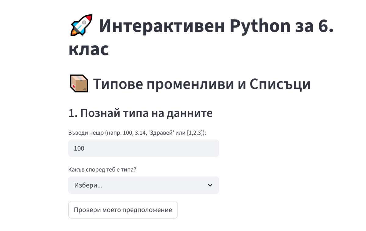 “искам да направя приложение за учениците от 6-ти клас, които учат език за програмиране Python, което да им помогне да разберат типове променливи, аритметични действия, цикли, приложението трябва да бъде с такъв инструмент, че да е безплатно.