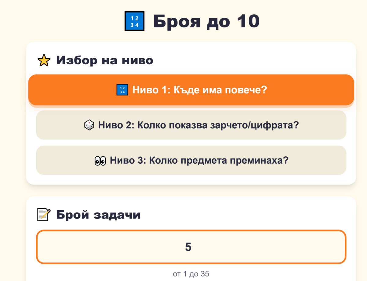 4. “Брой задачи” – Избира се колко на брой задачи да има в нивото – диапазонът е от 1 до 35.
