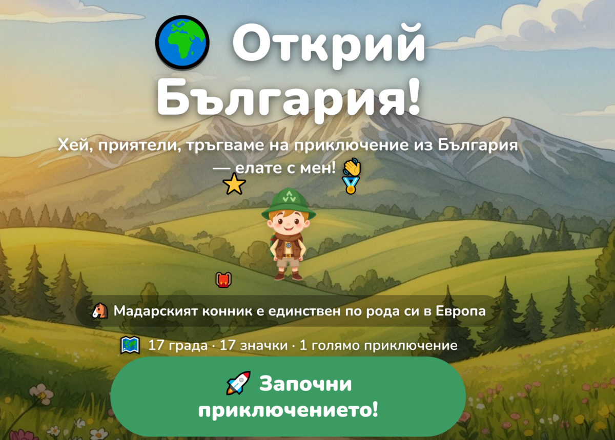 Ученикът си избира от картата на България град и се отваря информация за града, забележителности, традиционно ястие и кратък тест. При правилни отговори печели значка за посетеното място. Когато обиколи всички градове получава книжка с посетените места .