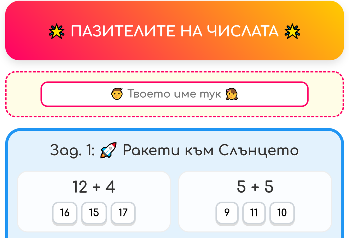 “Създай интерактивна браузър игра за деца с HTML, CSS и JavaScript, наречена „Пазителите на числата””. Играта трябва да има следните характеристики: