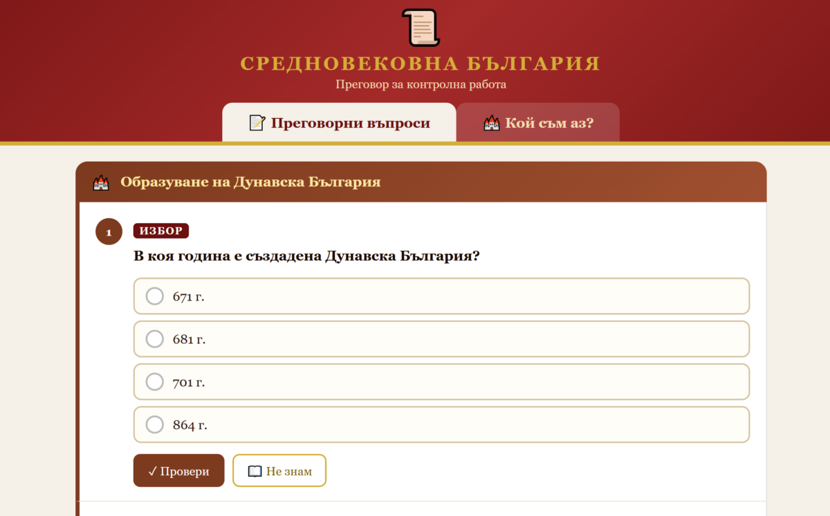 Използван учебник: на изд. “Клет”- “Булвест 2000”. Приложението има два раздела. В първия — Преговорни въпроси — учениците отговарят на 28 въпроса от пет теми: Образуване на Дунавска България, Хановете, Покръстването и славянската писменост, Златният век и Второто българско царство. Въпросите са от различен тип — с избор, наредба, свързване и отворени. При затруднение всеки въпрос има бутон с подсказка, който насочва ученика към конкретна страница и раздел в учебника. В края приложението дава автоматична оценка. Вторият раздел — Кой съм аз? — е игра, в която се показват подсказки за историческа личност и ученикът трябва да познае кой е тя. Колкото по-малко подсказки са нужни, толкова повече точки се печелят. Приложението работи на телефон, таблет и компютър, без нужда от интернет след свалянето му.
