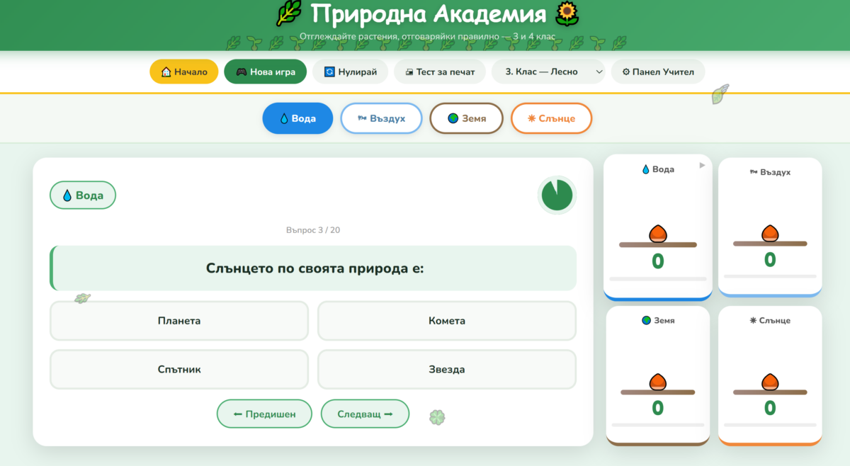 „Природна академия“ е интерактивно състезание, в което четири отбора – Вода, Въздух, Земя и Слънце – премерват сили в познанията си по предмета „Човекът и природата“. Основната цел е всеки екип да „отгледа“ своето виртуално растение, като дава верни отговори на въпроси за 3. и 4. клас. С всеки успех семето преминава през различни етапи на растеж, докато се превърне в разцъфнал слънчоглед. Играта разполага с вграден таймер за динамика, звукови сигнали и специален панел за учителя, чрез който въпросите могат да се редактират или принтират като работен лист. Това е отлично средство за преговор в клас, което съчетава ученето с елементи на геймификация и екипна работа.