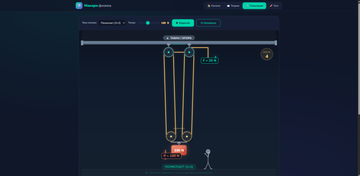 Приложението се отваря директно в браузър без инсталация и се състои от четири раздела, достъпни чрез навигацията в горната част: Начало, Теория, Симулация и Тест. В раздел „Теория” ще намериш подробни обяснения за всеки вид макара, формули и примери от реалния живот — прочети ги внимателно, преди да преминеш към практическата част. В раздел „Симулация” избери вид макара от падащото меню, настрой теглото на товара с плъзгача и натисни бутона „Издигни”, за да видиш как се движат въжето и товарът в реално време. Наблюдавай стойностите за приложена сила (F), тегло (P) и механично предимство, които се обновяват автоматично под анимацията.