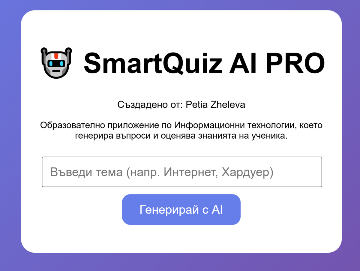 Потребителят въвежда тема от областта на информационните технологии (например „Интернет“, „Хардуер“, „Софтуер“) и натиска бутона „Генерирай с AI“. Приложението създава въпроси, на които ученикът отговаря директно в интерфейса. След това системата анализира отговорите и дава оценка. Вграден таймер създава условия, близки до тест, и подпомага концентрацията и бързото мислене. Приложението може да се използва за упражнение, преговор и проверка на знания както в клас, така и вкъщи.
