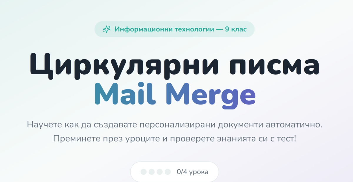 Искам да създам приложение, с което учениците от 9 клас по ИТ да се самообучават за циркулярни писма и после дa се проверява какво са научили. Добави видео към уроците.