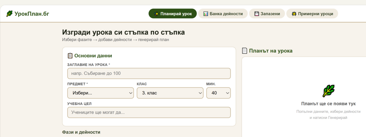 Планирай урок — форма с заглавие, предмет, клас, времетраене и учебна цел; 5 фази на урока с превключватели вкл/изкл (Загряване, Ориентация, Нови знания, Практика, Рефлексия); банка дейности за всяка фаза с кликване за избор; бутон „Генерирай план”” — без API, изцяло офлайн; изход с пълен план вдясно и бутон за принт