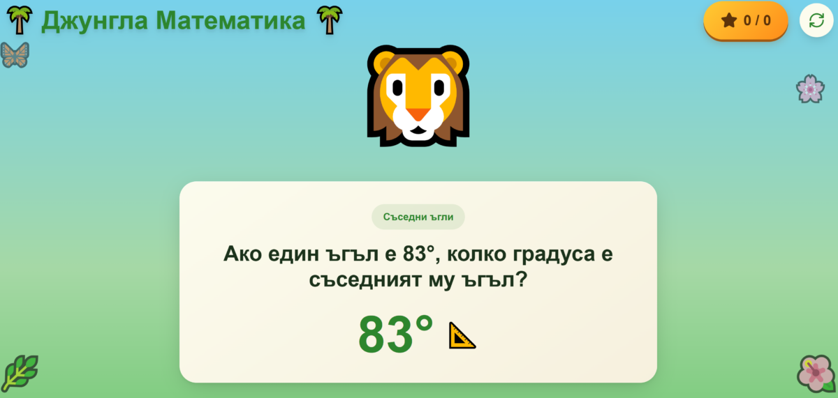 Избор на бутон, съдържащ възможен отговор. При верен отговор – звук на аплодисменти и подскачащо животинче. При грешен – нежен звук и подкана за нов опит.
