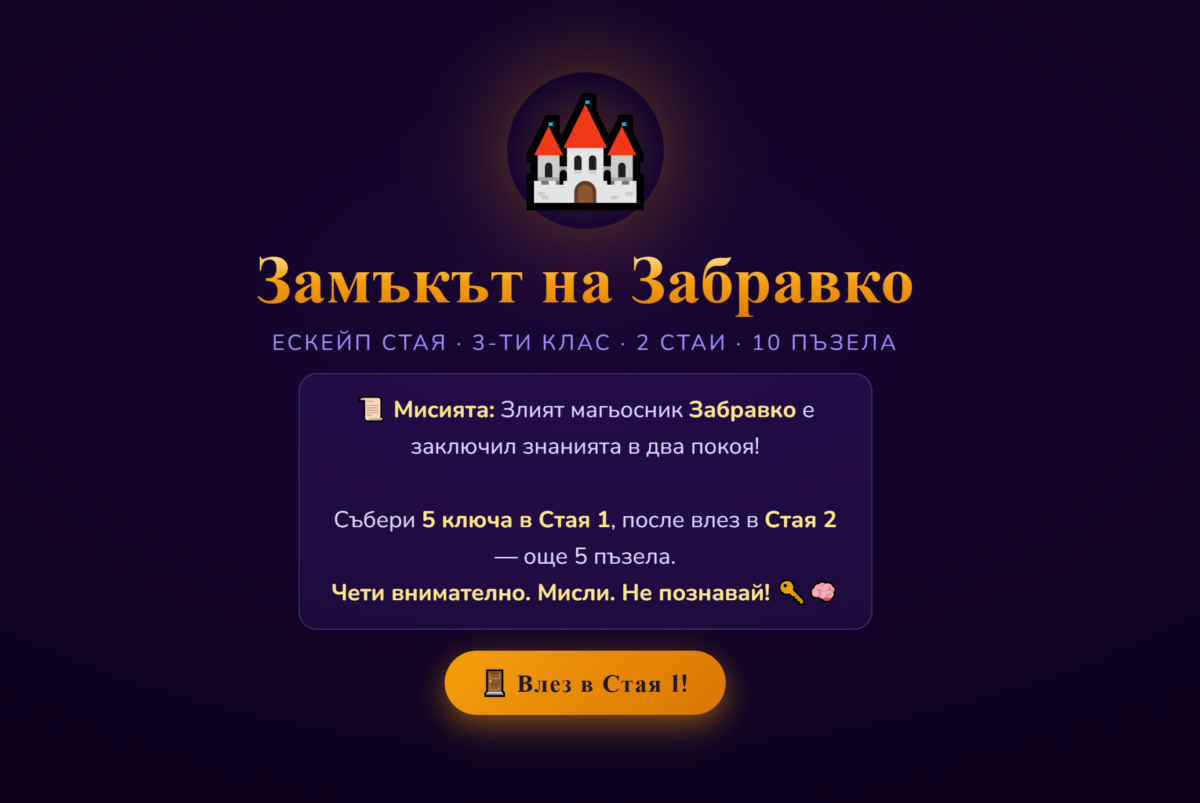 Замъкът на Забравко ЕСКЕЙП СТАЯ · 3-ТИ КЛАС · 2 СТАИ · 10 ПЪЗЕЛА