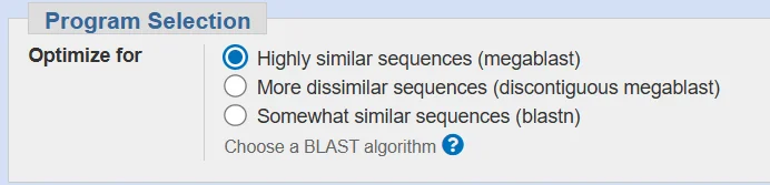 - Изберете с коя програма да се извърши сравняването на последователности. Ако сте избрали да сравнявате нуклеотидни последователности, изберете “Highly similar sequences (megablast)”, ако сте избрали да сравнявате аминокиселинни последователности, изберете “blastp (protein-protein BLAST)”