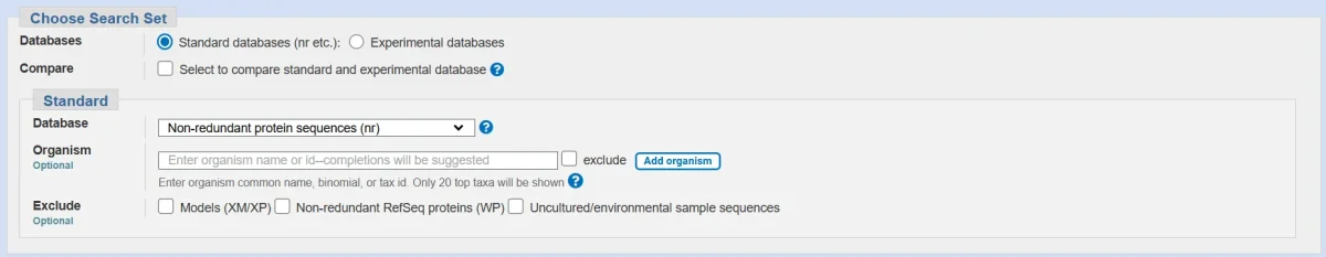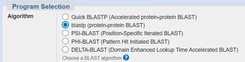 В падащото меню за база данни, учениците трябва да изберат протеиновата база данни „UniProtKB/Swiss-Prot(swissprot)“, а в полето за използван алгоритъм – blastp (протеин-протеин BLAST).