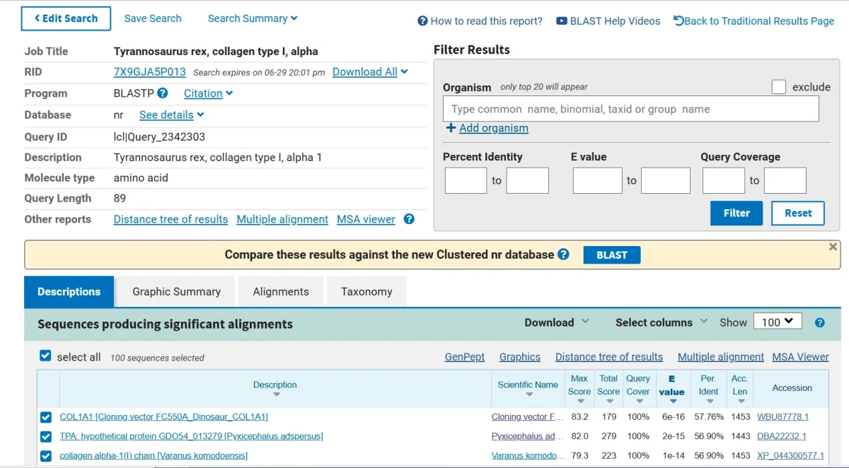 Всяка от главните букви представлява аминокиселина в протеиновата последователност. На местата, където протеиновата последователност не е известна, има тире (–), обозначаващо липса на участък с неопределена дължина. Имайте предвид, че по-голямата част от протеина не е била успешно секвенирана, но като се има предвид, че тъканта е била на 68 милиона години, е забележително, че е получена някаква последователност. Протеиновата последователност е във формат FASTA, което означава, че последователностите са предшествани от заглавен ред, който започва с “>” и завършва с нов абзац. Форматът FASTA е стандартното форматиране, използвано от софтуера за биоинформатика. Тъй като наличната последователност е частична, тя няма нужда да бъде ограничавана до определен брой аминокиселини.