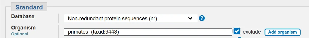 - Група “Човек” също използва идентификационен номер за търсенето. В случая този номер е YP_003024036 – пептидната верига на белтъка NADH-убихинон оксидоредуктаза верига 5 (ND5). Аминокиселинната последователност не е твърде голяма и няма нужда търсенето да бъде ограничавано. В менюто за избор на база данни, учениците от тази група трябва да отбележат “Standard databases (nr etc.)” и от падащото меню да изберат Reference proteins (refseq_protein)”. В полето за избор на алгоритъм се отбелязва blastp (протеин-протеин BLAST).