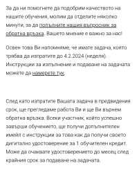 Разбирам, че сме получили имейли с различно съдържание за последващата задача. В моето съобщение пише като крайна дата 27.01. Други са получили с краен срок 04.02. Значи ли това, че и срока за обратна връзка се е променил?