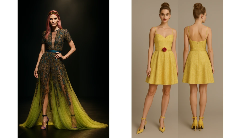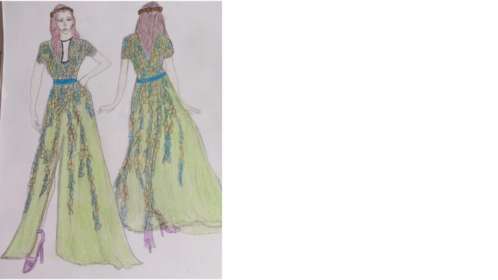 Процесът продължава с практическа дейност по изработване на скици на ръка. Всеки ученик разработва оригинален модел на облекло, базиран на предварително избрана тема (флора, фауна, геометрични тела и др.). На този етап учителят поставя фокус върху спазването на пропорциите, композицията и детайлите на облеклото. Тази стъпка е фундаментална, тъй като гарантира, че крайният дигитален продукт ще се основава на авторска концепция, а не на случайно генерирано съдържание. По този начин се запазва връзката с традиционните художествени дисциплини.